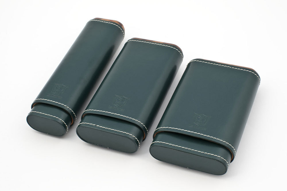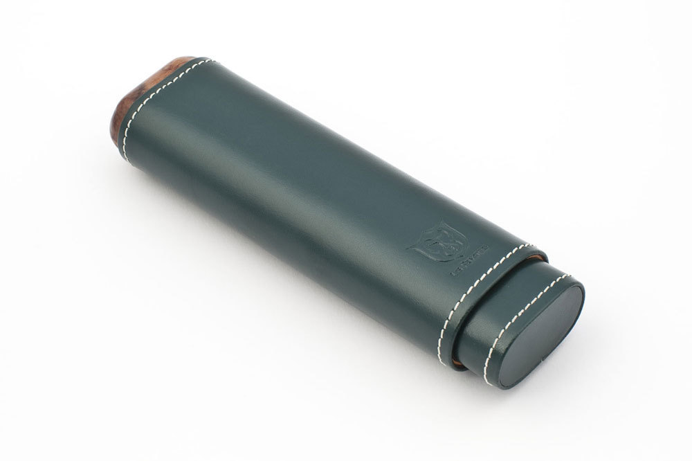 Zigarren Etui/Leder - in Originalfarbton der Marke Les Privatiers - british racing green; Das Etui hat auf der Vorderseite eine Prägung der Marke Les Privatiers; es kann max. zwei Zigarren der Größe 52 x 192 mm (52 x 7,5 inch) aufnehmen; innen ist das Etui mit Zedernholz ausgekleidet, welches die Feuchtigkeit der Zigarre während der Reise halten soll.
